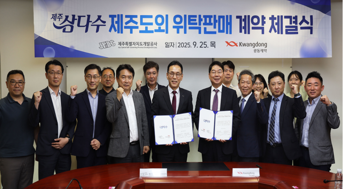 제주특별자치도개발공사는 9월 25일 제주개발공사 본사에서 광동제약과 ‘제주삼다수 국내 유통 위탁판매 본계약’을 체결했다. 이번 계약에 따라 광동제약은 2026년 1월부터 2029년 12월까지 4년간 제주도를 제외한 국내 전 지역의 제주삼다수 유통을 담당한다.