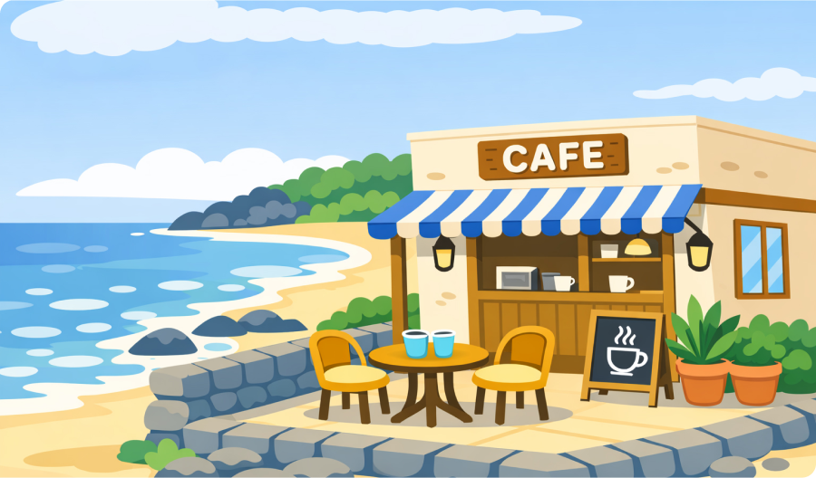 창밖으로 바다가 보이는 카페, 돌담길 옆 작은 상점, 오름 아래 조용한 로스터리까지.